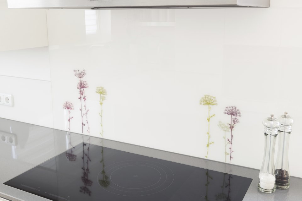 Spatwand van glas voor de keuken of sanitaire ruimte