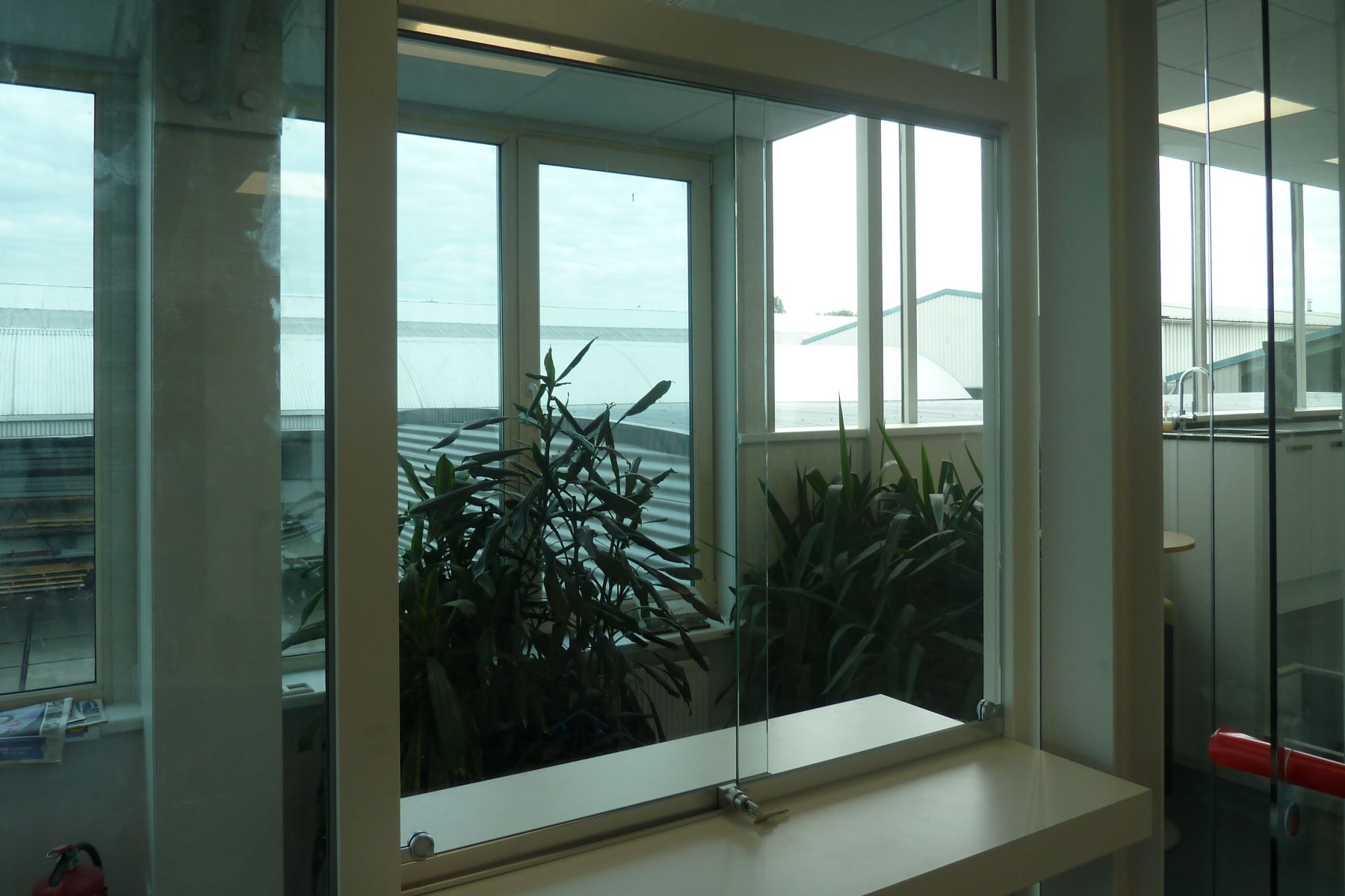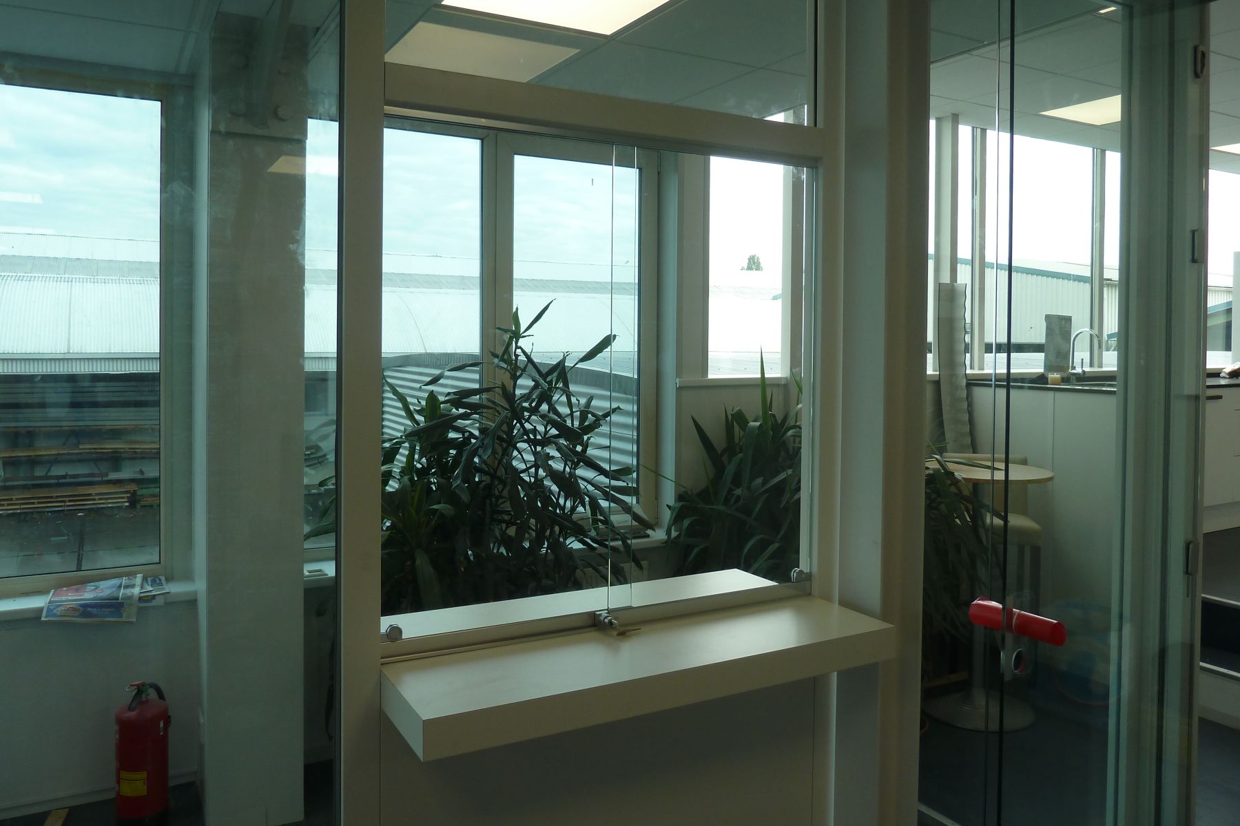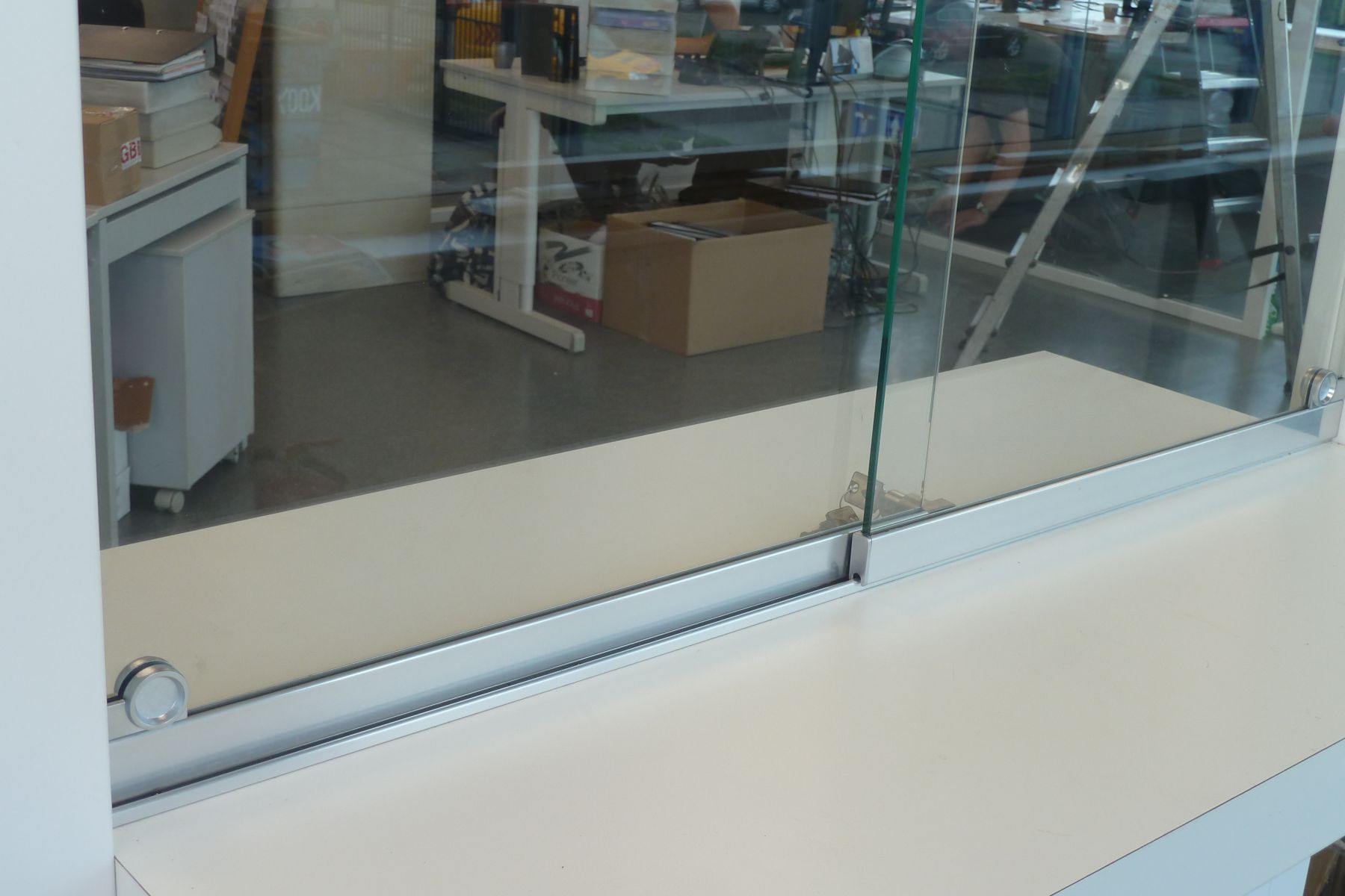 Hijman Glas heeft de balie van een transportbedrijf in Den Haag voorzien van een schuifloket. Het schuifloket is gemaakt van 6 mm gehard glas. Het glas is rondom geslepen om scherpe randen af te werken. De handgrepen, boven- en onderrail zijn afgewerkt in de kleur geannodiseerd zilver.